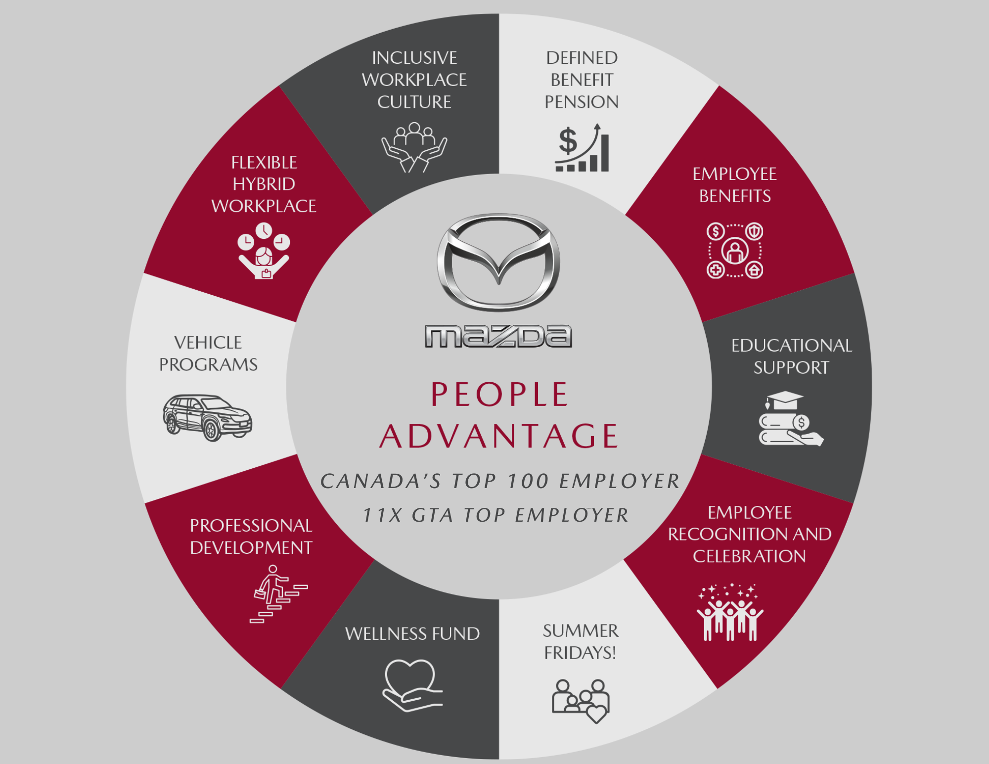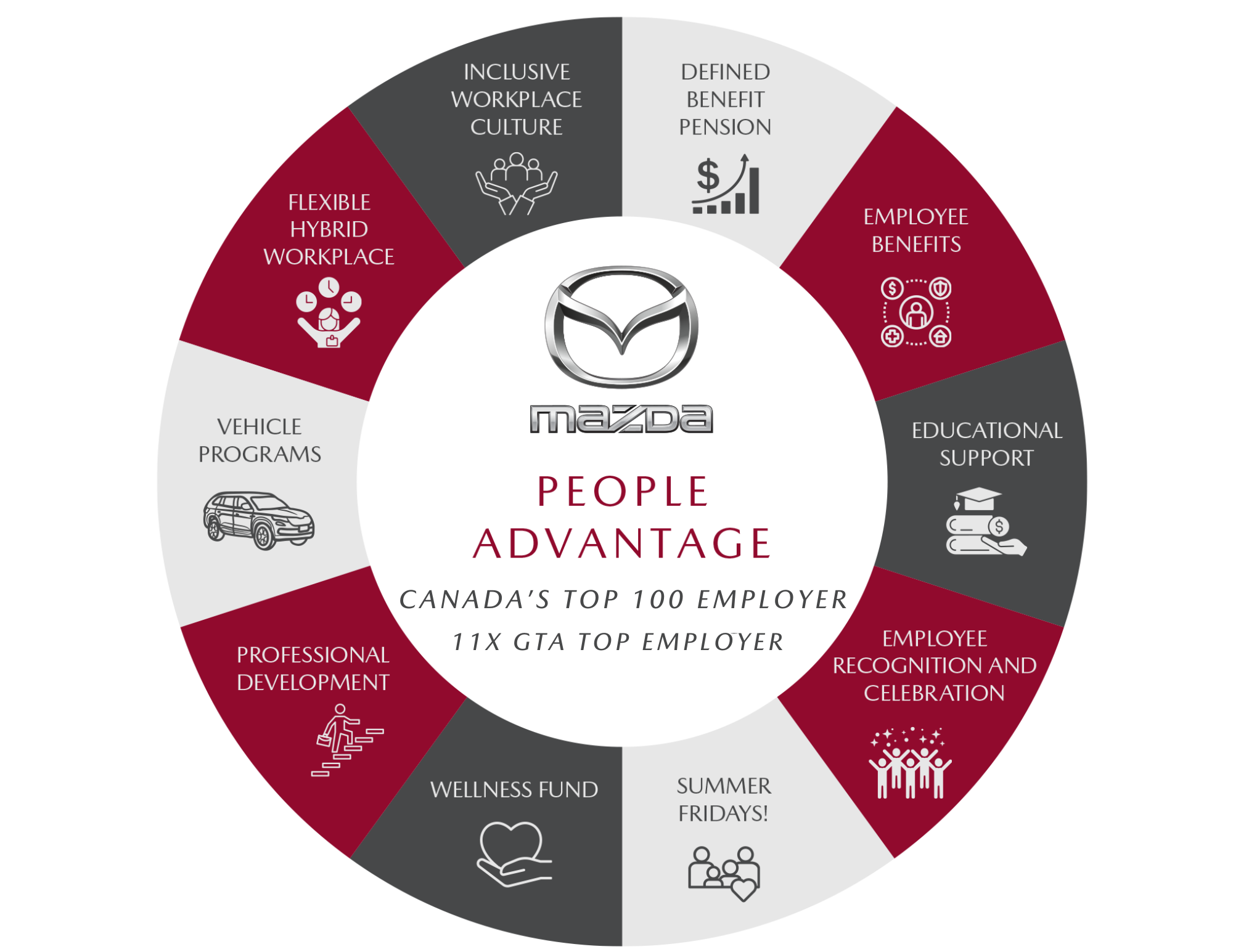At Mazda Canada, our people are at the heart of everything we do. That's why we are proud to display our Mazda People Advantage Wheel. This wheel demonstrates our unique and differentiated employee experience that all points to our strong internal culture. Thank you to our employees who uphold our values and contribute to our positive workplace!