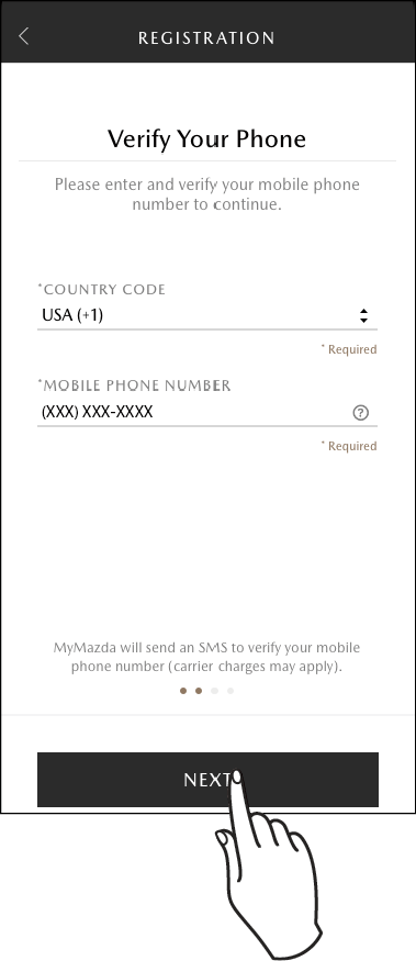Enter the phone number you want the MyMazda APP to use, and then touch NEXT. In addition, touch NEXT on the phone number re-entry screen for confirmation.