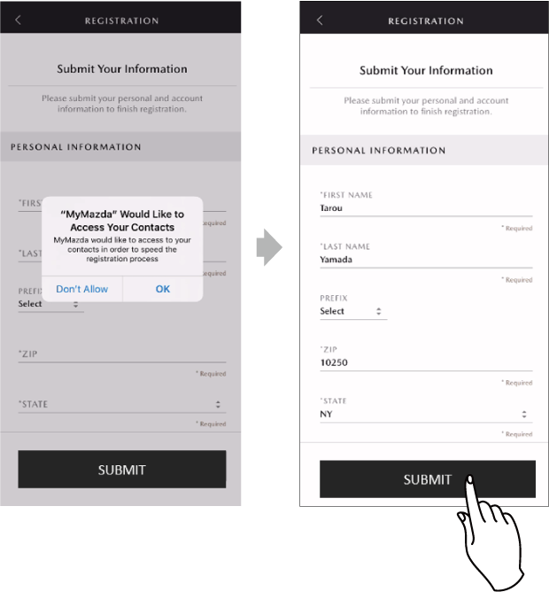 • When [Don't Allow] is selected, enter the information according to the screen directions and then touch SUBMIT for the last time.
