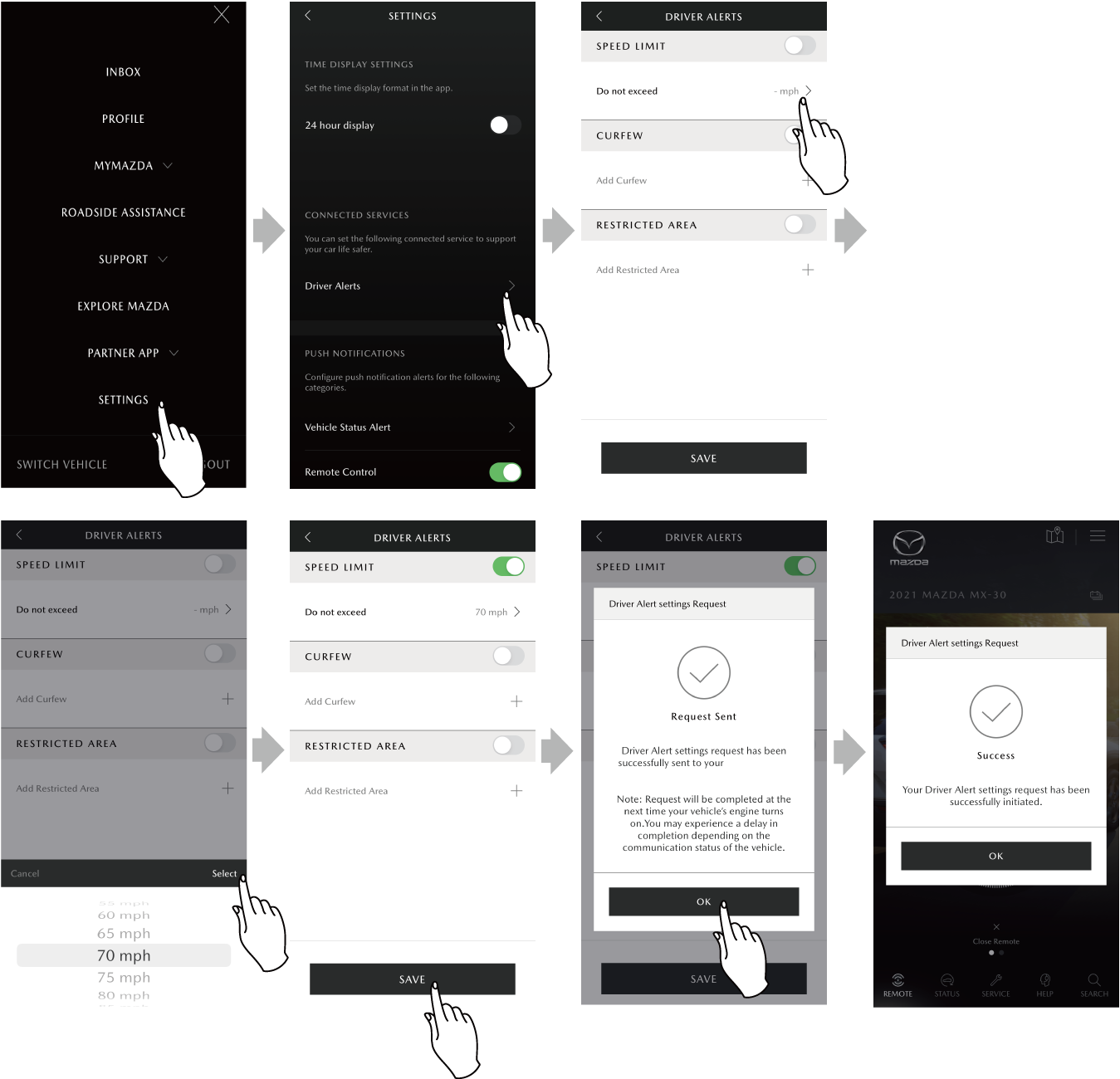 When you set the following notification conditions in the MyMazda APP, a notification will be sent to your cell phone when the conditions are met.
